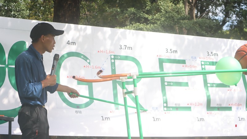 過山車落地并不代表項(xiàng)目已經(jīng)結(jié)束,要通過籃球來驗(yàn)證過山車是不是足夠牢固、可靠。小心翼翼地將籃球放在過山車的最高處,由于重力籃球向下沖去,在拐彎處我們都提著一口氣,生怕籃球“脫軌”。幸好一路上有驚無險(xiǎn),籃球安全到達(dá)終點(diǎn)。