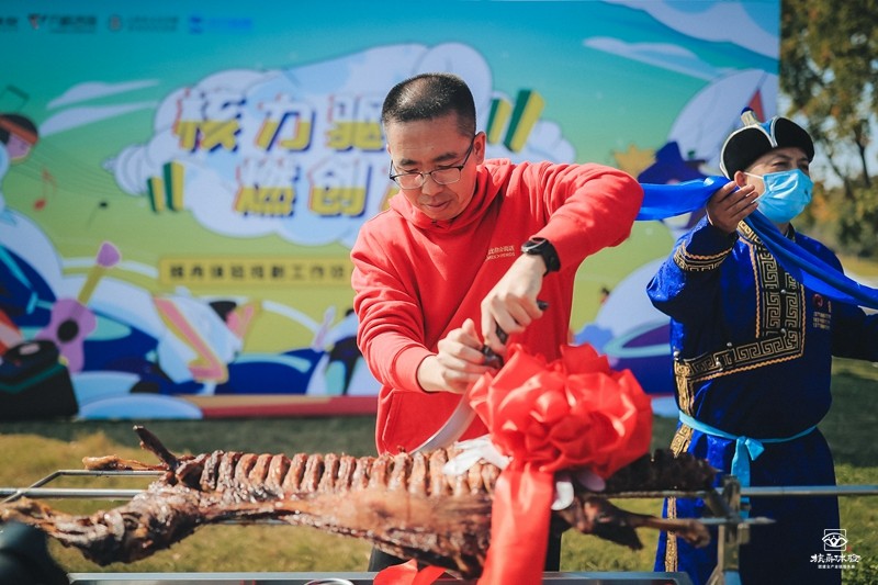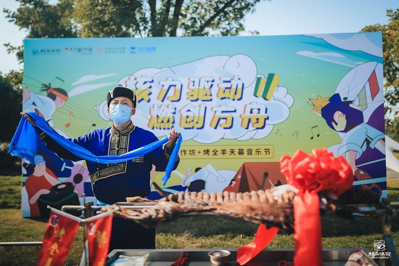 烤全羊是啟位大菜,位尊者要先唱歌, 獻(xiàn)哈達(dá),敬酒,